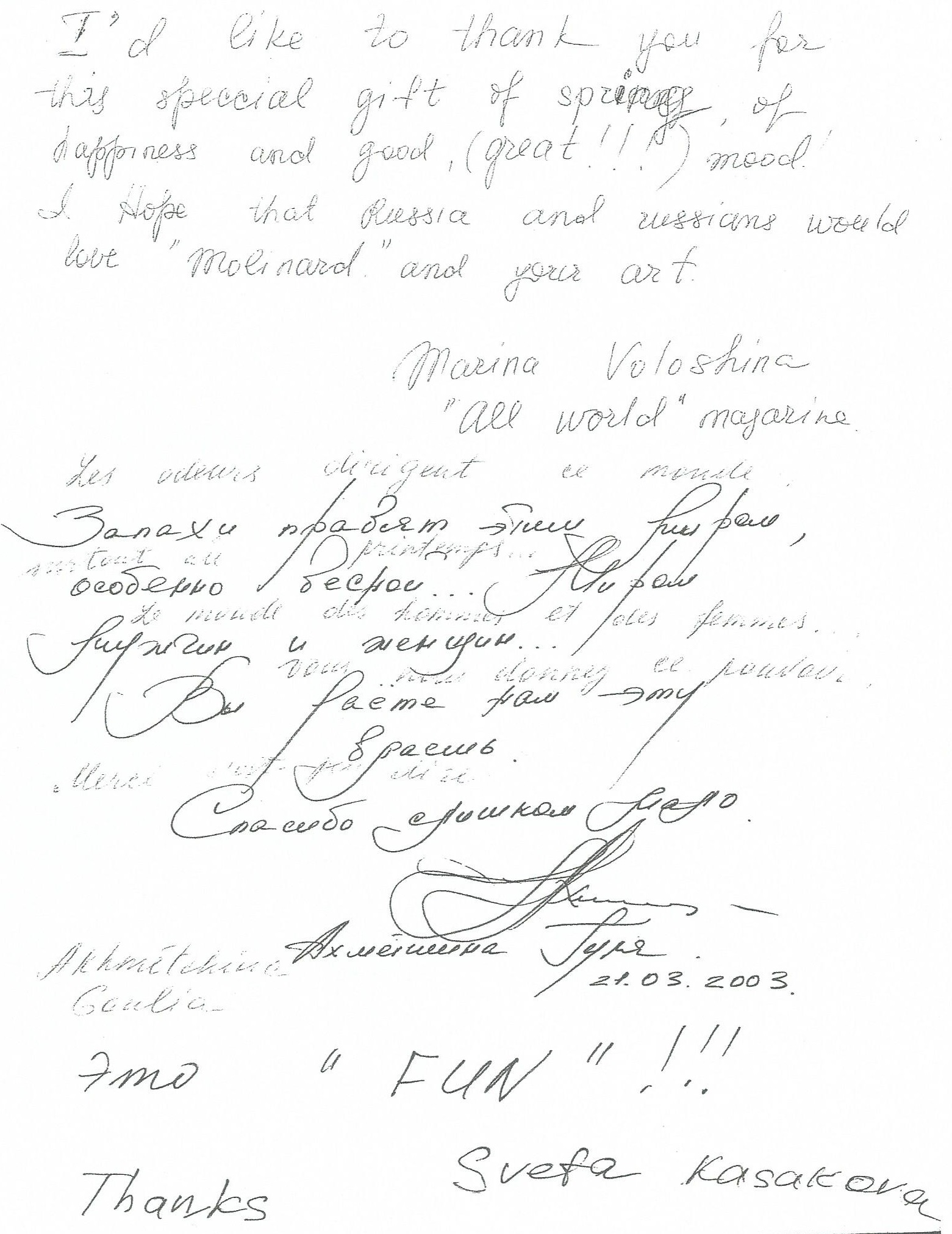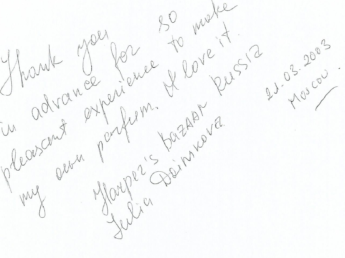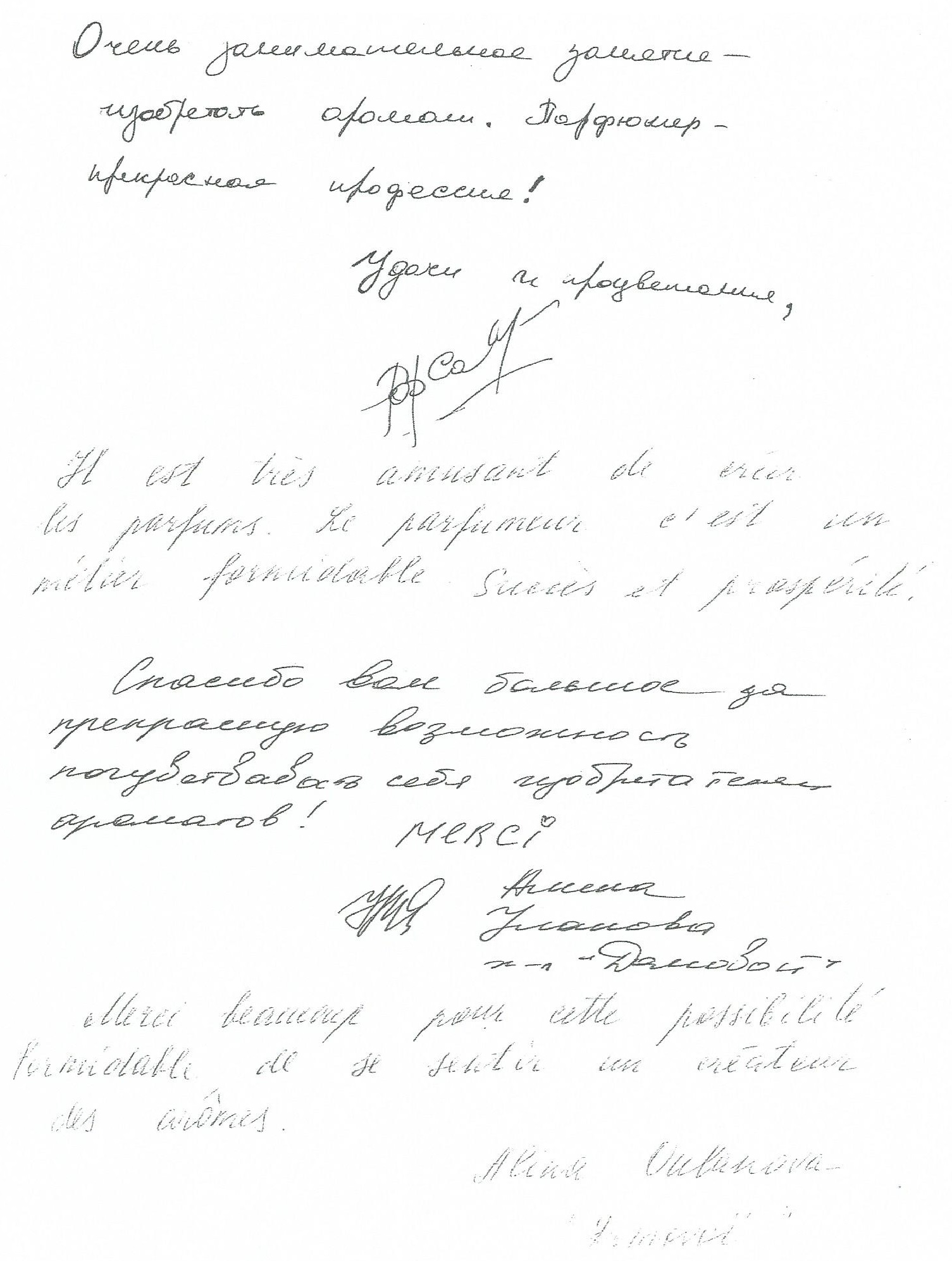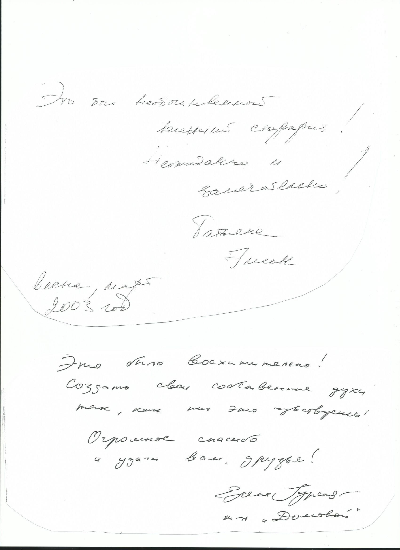 The fun side would be gaining valuable market research by organizing a personalized perfume creation with the winning perfume’s formula to be used for the future russian perfume to be called “L’inachevé” or the “unfinished”. Russian women (and some men) from all walks of high society – industrial – media etc. particpated in making their own perfume and a small part of history at the same time. After 1 year, I had over 300 perfume formulae, showing a tendancy towards a certain style of perfume – a light floral/fruity fragrance… Below are some of the articles from Russian lifestyle publications…