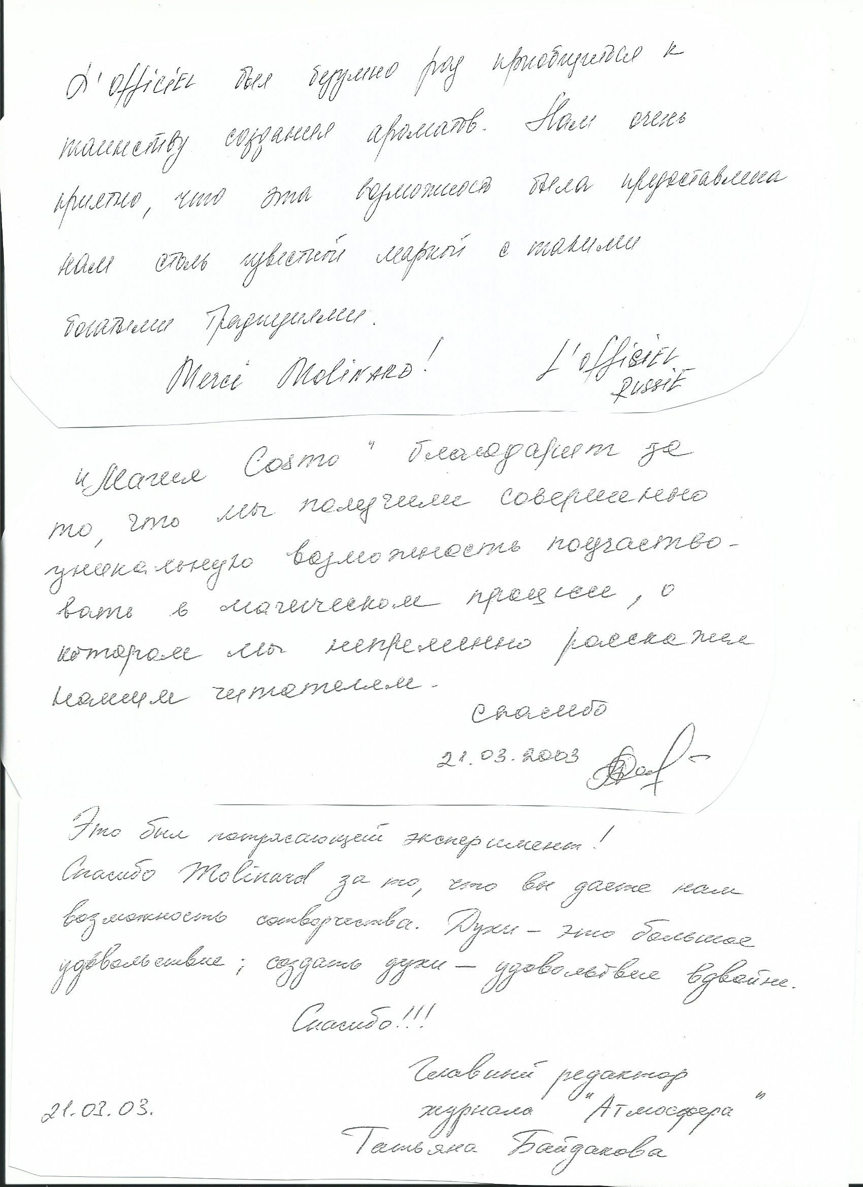 The Russian perfume and cosmetics holding ARTICOLI were delighted to distribute Molinard’s perfume products in its select boutiques in Moscow and Saint Petersburg. Unfortunately, despite the very successful marketing and the support from the russian perfume and cosmetcis industry as well as the press, the perfume still remains “unfinished”. There were certain “differences” between my views of the brand strategy and that of Molinard’s CEO. My deception (as well as that off many russian perfume enthusiasts) was enormous as well as my incomprehension. But this is not MY perfume house and the modern russian woman doesn’t have THAT special fragrance that was long destined for their market. Maybe one day? Here are some of the comments made about the event…